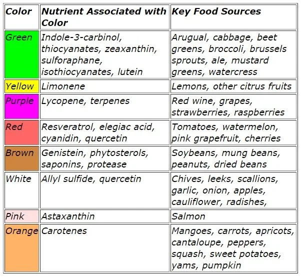 Phytonutrients are "other" nutrients that provide health benefits that are found in plant based foods such as fruits and vegetables. These are crucial nutrients that help us fight against colds and flus as much as they help fight against cancer. Eating a RAINBOW of vegetables and fruits will ensure that you are fulfilling your nutrient quota that is necessary for your body to function at a its best. Here is a list of some of the beneficial ones and where they are found.